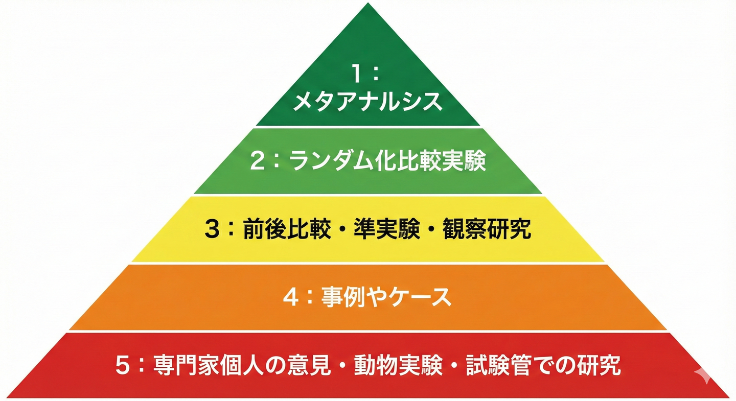 科学的エビデンス(根拠)とは、情報が「どれくらい信用できるか」を表す「信頼度ランキング」のことです。