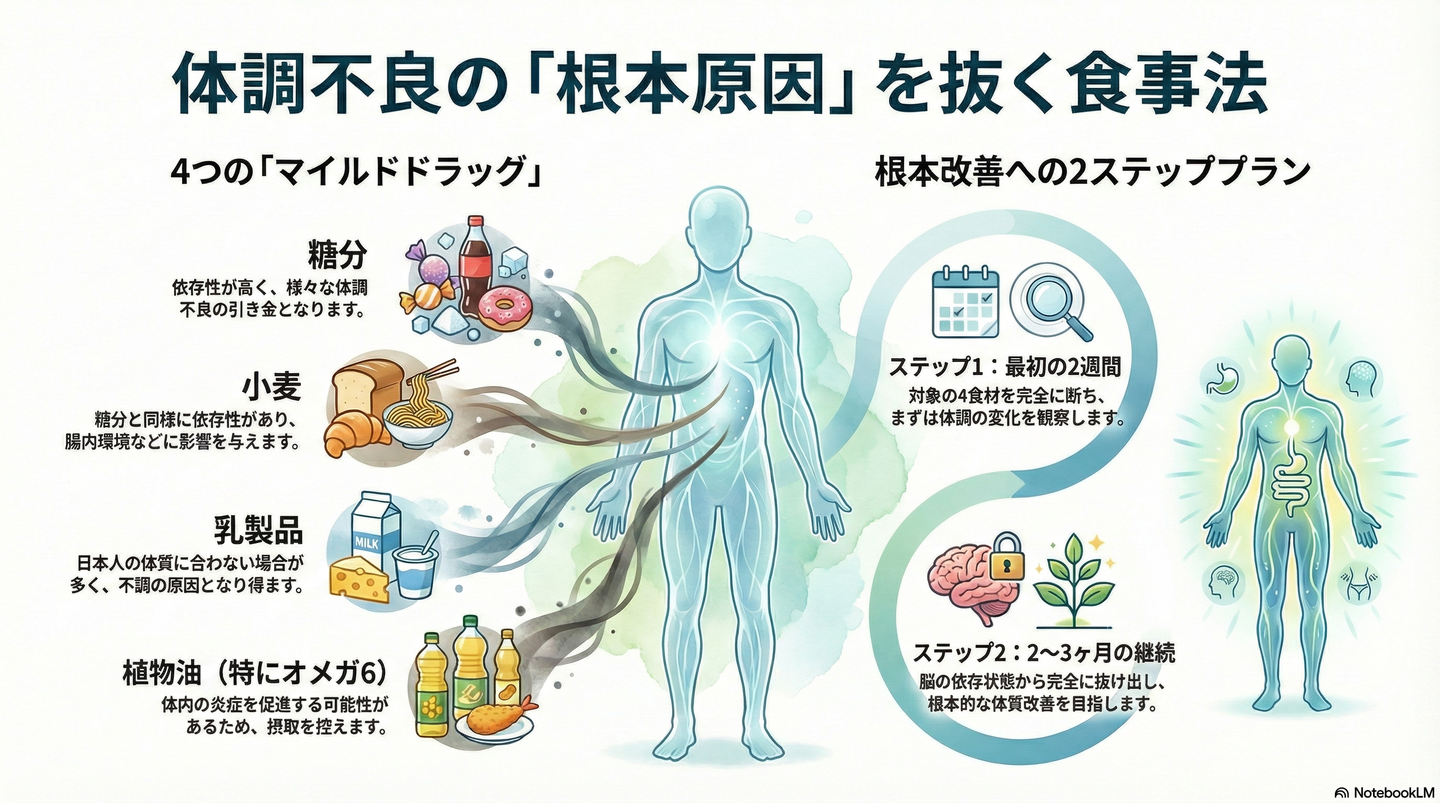 多くの方が健康のために良かれと思ってやっていることが、実は不調の根本原因から目を逸らす「対症療法」になってしまっているケースを、私はたくさん見てきました。対症療法とは、頭が痛いから鎮痛剤を飲むように、今ある症状を一時的に抑えるための方法です。しかし、それでは不調の根本的な原因は解決されません。本当に大切なのは、なぜ不調が起きているのかという「根本原因」を探り、それを取り除くことです。食事における基本原則は、非常にシンプルです。体に不調の根本原因となるものを入れないこの原則に立ち返ることが、健康への最短ルートなのです。