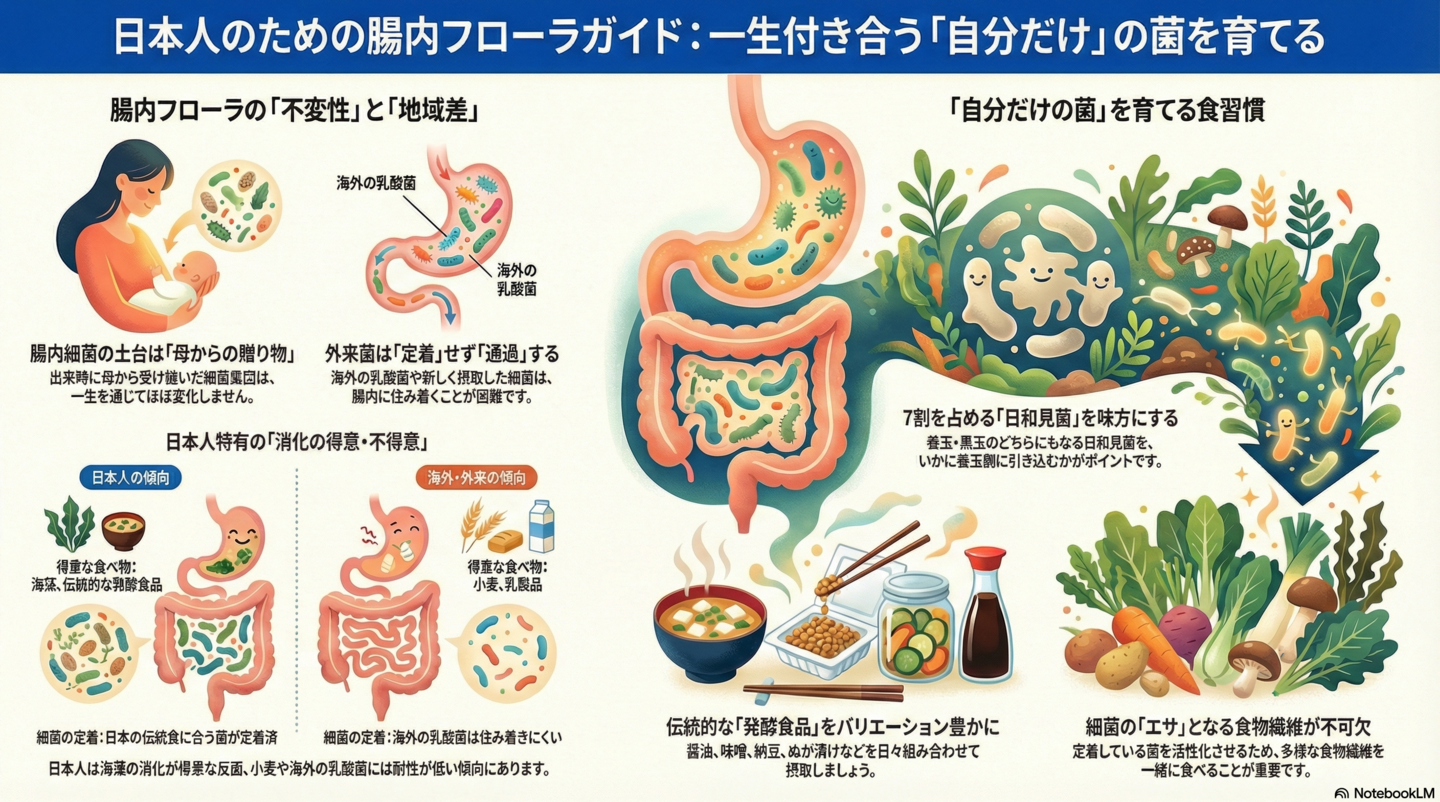 腸内フローラの構成は、まるで「指紋のように」一人ひとり全く異なります。それは、私たちの遺伝子や生活習慣、そして食文化が複雑に絡み合って形成される、非常にパーソナルなものなのです。