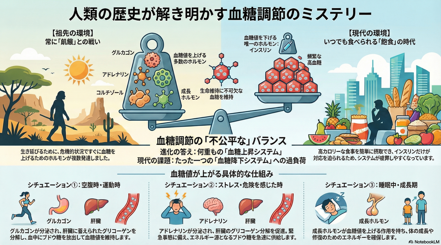 人類の数百万年におよぶ歴史の大半は、食料が乏しい「飢餓」との戦いでした。いつ食べ物が手に入るか分からない厳しい環境では、生命を維持するために、いつでもエネルギー源(糖)を血液中に供給できることが何よりも重要でした。つまり、私たちの体は「いかにして血糖値を上げるか」を最優先課題として、進化してきたのです。