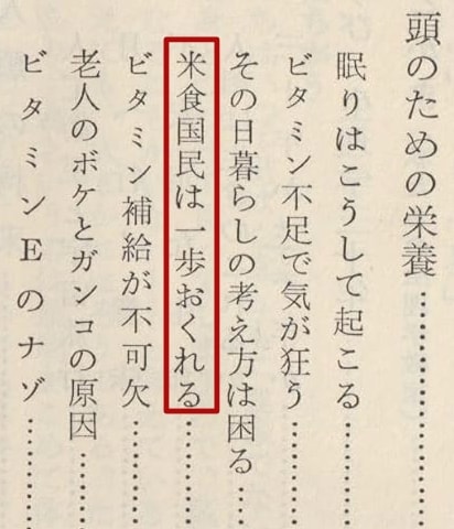 - 主要な主張: 「日本人が欧米人に比べて劣っているのは、主食の白米が原因である」「米を食べるとバカになる」「頭をよくするにはパンが最良である」。